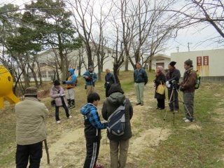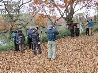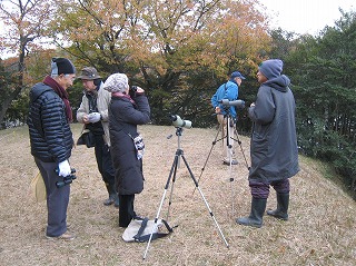 初心者の参加もあり、双眼鏡の使い方を聞いた。 まず、左目で遠くの目的物をとらえ、双眼鏡の中央の目盛りでピントを合わせる。次に右目で目的物を見て双眼鏡の右目元の+〇−(又は数値)でピントをあわせる。例、鳥を見るならばその鳥を裸眼で見ていて、双眼鏡のほうを目の位置のもっていく。すぐに鳥や目的物をとらえることが出来るようになった。