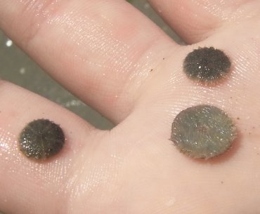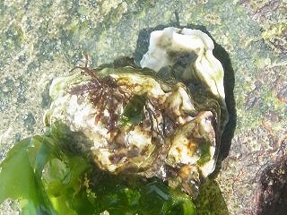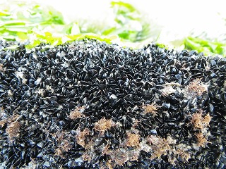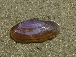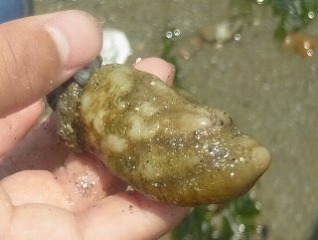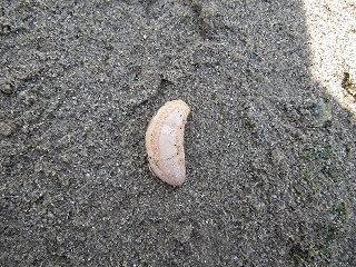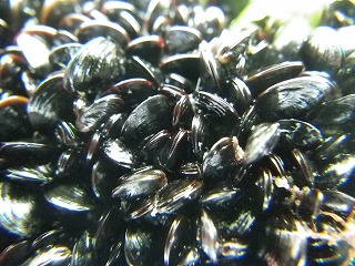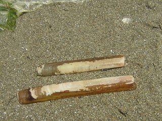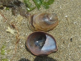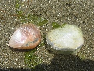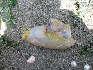 【左】アメフラシ(死骸) 【中】ムラサキイガイ 【右】ムラサキイガイ