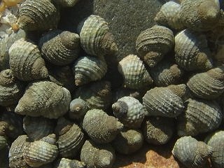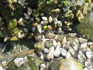【左】イボニシ 【中】イボニシ(卵嚢) 【右】スミウキゴリ/