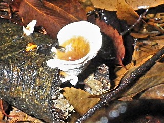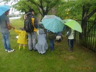 梅雨そのものの天気で、観察会の実施に迷うような天気でしたが、2家族の参加があり、「子どもが金曜日からこの日を楽しみにしていた」と言った家族の参加でした。はじめに挨拶。「キノコの仲間は身近にある=菌」の話をして、足元に注意をしながら、観察をはじめた。さくらの根元にダンゴムシがたくさん集まっていて、そこにセイヨウミチバチが水を飲みに来ているのをみました。こども達は虫に興味がありそうでした。