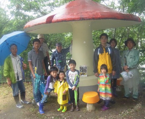 【左】 キノコ屋根の休憩所で記念写真                                    【右】森の中にたくさんキノコがありました。