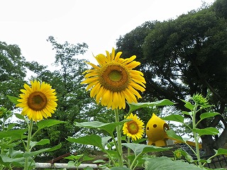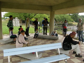 集合時刻前後は僅かに小雨が降っていましたが、終日曇り空の蒸し暑い観察 会になりました。園内のミツバチ牧場は大曽公園(岩間造園)が「新海養蜂場」に 委託して運営しています。公園での蜜蜂絞り体験行事は今年も数回行われており、 今回は知多自然観察会が協力させて頂きました。