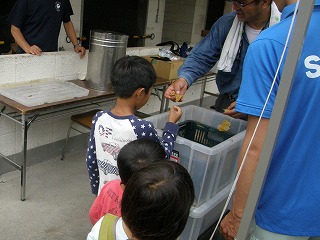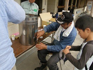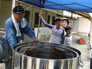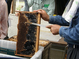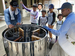 巣箱から巣棚(巣礎)を取り出し、燻煙、蜜蝋の掻き取り、遠心分離、異物除去 フィルタリング、試食はいずれも興味深く参加者から歓声が上がっていました。 絞った蜂蜜は小瓶に詰めて頂き、家族毎に一瓶500円で分けてもらいました。 終了予定時刻には30分程早かったのですが、暑さ疲れや子ども達の様子を見て 観察会を閉会しました。来年度への継続期待の声も多々聞きましたのでさらに一 工夫したいと思います。 (記・森田)