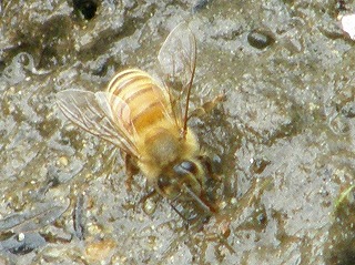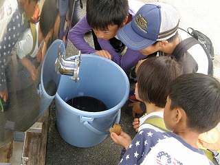 蜂蜜絞り体験に先立ち、セイヨウミツバチの生態を知ってもらうため「水飲み 場と給水行動」を観察しました。夏場の給水は巣を冷やしたり、幼虫に餌を食べ させる時に使われます。蜜蜂の役割り分担や蜜蜂のダンス等について話題を提供 した後、10時頃から蜂蜜絞りの実演を見せて頂きました。