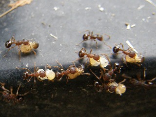 【左】蜜源のサルビア(ハナバチが飛来) 【中】幼虫を背負って移動するアリ発見 【右】幼虫を運ぶ(ハチに近い仲間で、社会性の集団で生活)