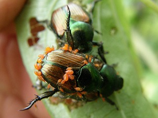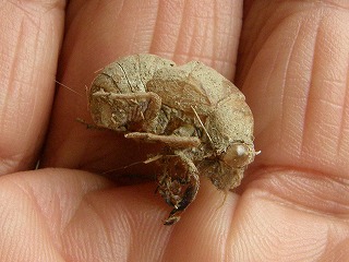 【左】ニイニイゼミの抜け殻 【中】マメコガネに寄生したダニ類 【右】ヘクソカズラ(別名ヤイトバナはもぐさに火が付いた様子の名)