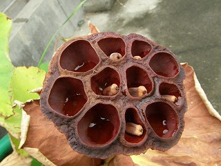 【左】ハスの果実を観察 【右】ハスの名前は果実がハチの巣に似るから