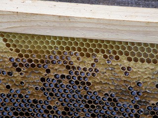 【左】煙でミツバチの動きを鈍らせ巣板から刷毛でハチを下す 【中】巣穴に詰まった蜜 【右】ハチの玄関