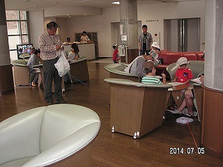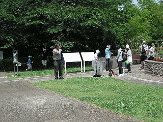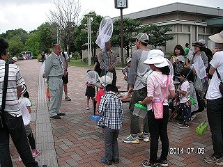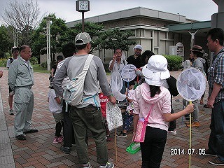 朝起きたらドン曇り、天気を心配しつつしあわせ村に向かいました。9:30から施設管理事務所長さんのあいさつ、原さんのオオケマイマイ、吉川さんの注意事項についての説明があり、観察に出かけました。はじめは曇っていてかたつむりしかみつからず、期待した芝生広場はトンボもチョウも見られませんでした。その代わりに吉川さんが植物を観察しながらいろいろ話してくれました。ケーブルテレビが来て原さん、吉川さんが取材を受けました。10:30頃から晴れて来て展望台ではコシアキトンボが飛び始めました。ハーブ園でチョウやトンボを親子で追いかけ、隣の林(オオケの谷:村瀬さん命名)でオオケマイマイを何匹も見ることができホッとしました。最後の花壇周辺はセミが鳴き、トンボ、チョウ、バッタも多く見られ、虫かごがいっぱいになる親子もありました。観察終了後、保健福祉センター談話室でまとめをして観察会を終了しました。(記・平松俊)