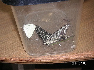 【左】ナミアゲハとモンシロチョウ 【中】カマキリ類幼虫とショウリョウバッタ幼虫 【右】ショウジョウトンボ