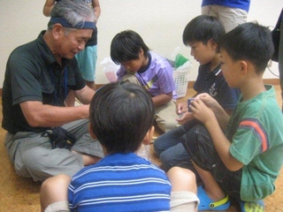 【左】開会のあいさつ    【右】さっそく、ごむ銃=パチンコづくりが始まった