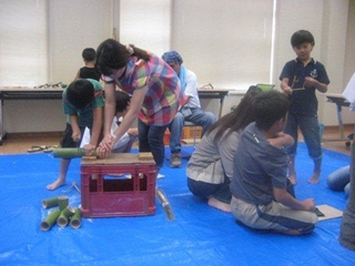 一方、コップ作りは直径数センチの青竹を鋸で切ることから始めるが悪戦苦闘する大人も少なくない。次に切り口の面取りを紙やすりで行うがこの作業がまた大人気、ひたすら磨き続けて時間がたつのも忘れそう。