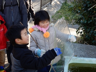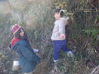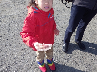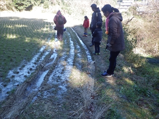 子どもたちは氷をが張っているのを素手で掴んだり、水たまりの氷で遊んだりして元気でした。
