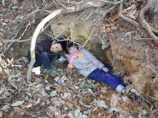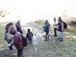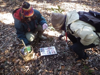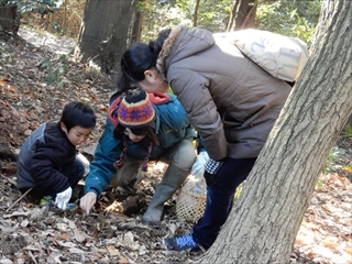【左】始めのあいさつ    【右】林内で冬眠中の虫探し。なかなか、いない