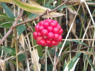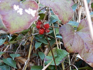 道中美しいサネカズラの脇にフユイチゴを見つけてみんなで味わいました。