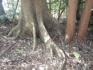 【左・中】こんなくぼみでも子どもは遊び場にする   【右】この神社、スダジイの板根が目立つ