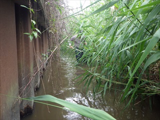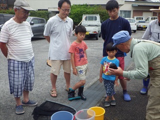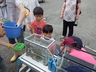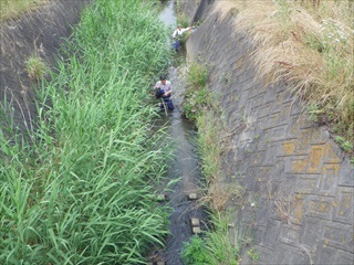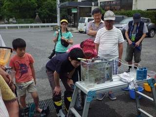 集合地点のすぐ前にある階段で川へ降りるのであるが、その階段で一般参加者(親子)と一緒に指導員が降りて、同時に採集活動をすると、ついつい、指導員が“いい場所”で“いいモノ”を捕りまくってしまい、親子が獲れない現象が起こる。