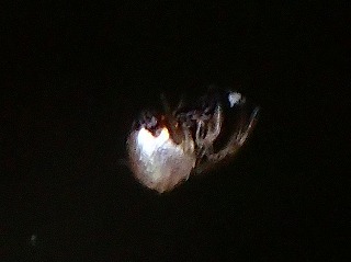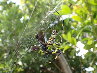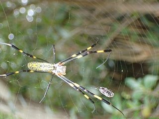 【左】 ハエの仲間をとらえたジョロウグモ           【右】 ジョロウグモの巣の中聞いたシロカネイソウログモ