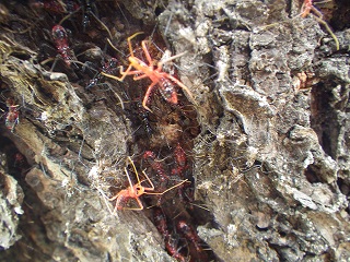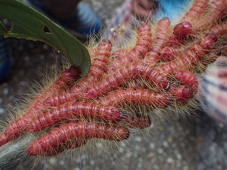 【左】ヨコヅナサシガメの赤ちゃん…赤色は脱皮後間もない 【中】イラガ 【右】ニイニイゼミの抜け殻。いっぱいあった
