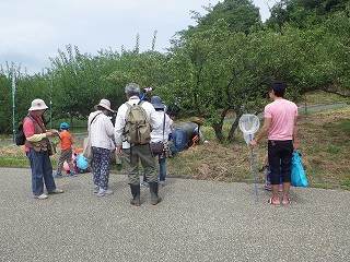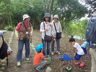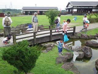 【左】指導員がバッタの採り方を直接指導 【中】バッタのつかみ方の練習 【右】カエルのつかみ方