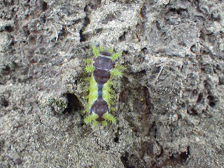 【左】モンクロシャチホコ(蛾)の幼虫 【中】モンクロシャチホコ(蛾)の成虫 【右】ショウジョウトンボ。水場で採った