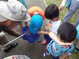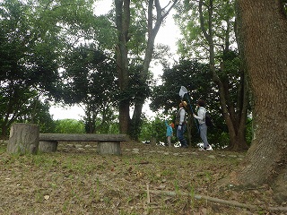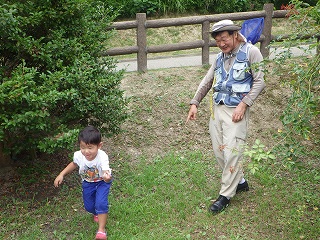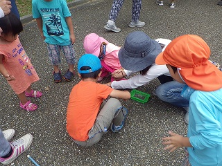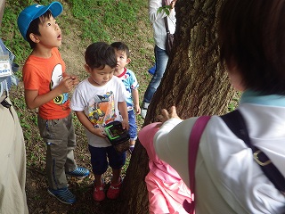 【左】草むらの中で色んな虫さん探し 【中】セミの採り方…むずかしい 【右】ここでセミの抜け殻をいっぱい採った