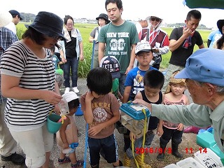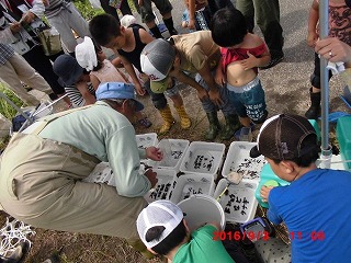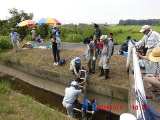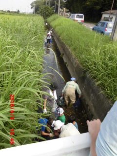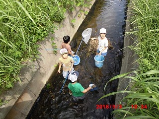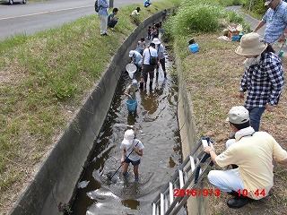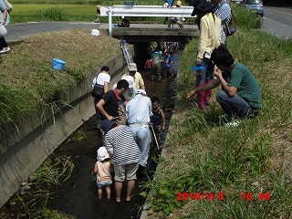いよいよ水路に到達、さっそく水路の中へ。水深はおよそ20cmと手ごろで水遊びもかねて上流へ下流へとカニや魚を追いかけてジャブジャブ。ウナギのほかドジョウ、カニも大小取り交ぜて容器もいっぱい、これらの説明も大変でした。
