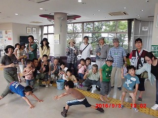 最後に暑い中こども未来館への帰途につき、館内でみんなで記念写真、元気なお子さんもいたよ!(記:吉川)