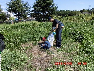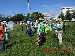 会議室で会社の様子やグリーンベルトの歴史と現在観察した生き物に付いての説明があり、4つのグループに分かれてグランドに出た。昆虫が楽しく活動できる好天気に恵まれ、上空にウスバキトンボやシオカラトンボ、足元の草むらにコオロギやバッタが沢山いて子供達の歓声が上がった。全員がなにがしかを捕らえ虫かごに入れることができ大喜びである。グランドでは4面使って、会社対抗のソフトボール大会が行われていたにもかかわらず、自然調査隊が緑地帯へ入るため、一時試合を中断し、皆さんにこやかに手を振って送り出して下さった。グリーンベルトの木々は年々立派に成長していて驚くばかりである。ただ台風で大きな木が数本倒れかかっている様子から、埋め立てのため地下に十分根を張ることができないのだと痛感した。子供達は木々には目もくれず、クワガタ、カブトムシ、セミ等を探すのに夢中である。鳥に食べられてばらばらになっているカブトムシの残骸がいくつもあり「何が食べたのだろうか?」とがっかりしていた。池の前でクワガタムシが沢山集まるというシラカシの穴を交代で探していたが、全員分は見つからなかった。いつも感心するのはどの親御さんも生き物が大好きで、その思いが自然に子供さんにも伝わっていることだ。さわやかな日で子供も大人も楽しめた半日である。 (記:吉房)