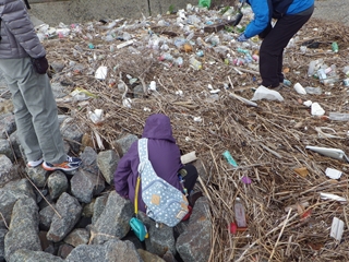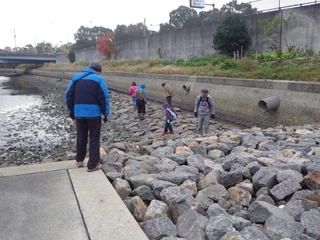 【左】阿久比川での観察。遠くのアオサギを観る 【右】漂着ゴミだまりで木の実などを探す