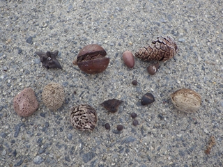 【左】習慣的に何かないか探し回ってしまう 【中】ゴミだまりの場所 【右】同左で見つけた種子など。黒い小さな丸は同定不明