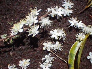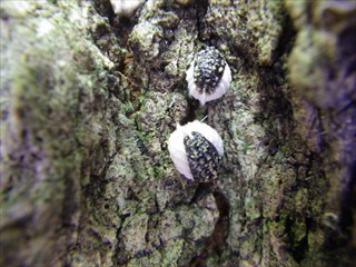 【左・中】路上に落ちたクロバイの花。昨日の下見で撮影  【右】コナラの幹にいたカイガラムシの仲間。種名不明