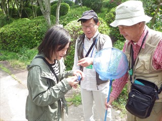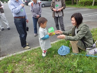 【左】集合場所。開始前の草花遊び  【右】開始後早々、お母さんがモンシロチョウをつかまえた