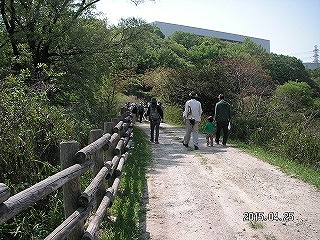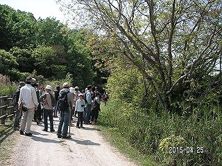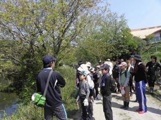 今年は4月の雨が多く、急に暑くなって竹の子が急に伸び出したかと期待させるような、初夏を思わせる日となった。ハルジョオンが咲きそろい、タンポポ綿毛が背伸びをしている自然環境学習の森駐車場に集合した。雨で延びていた石浜のコミュニティー行事とも重なって竹の子目当てのたくさんの人が集合してのスタート。水野指導員の自然の話を聞きながらゆっくりいきたいチームと、竹の子まっしぐらチームに分かれて思い思いに森の中へ進んでいく。日なたは汗ばむが日蔭はさわやかな風が吹き抜け、最高のお散歩日和。頭上ではコナラの新芽や藤の花、そして花に集まる虫たちの活動が活発な季節になった。