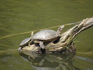 【左】話をしながら進みます 【右】アカミミガメの甲羅干し