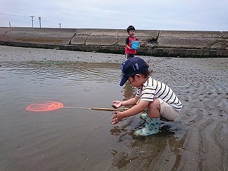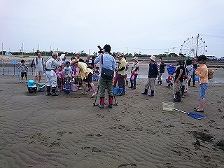 梅雨の晴れ間の穏やかな1日となり、集合場所のあいち知多農協奥田支店駐車場には、15家族、39名の一般参加者に集まっていただきました。指導員から今回の観察会の予定説明があり、車で山王川河口の樋門近くの駐車場まで移動しました。美浜町環境保全課職員に持参していただいた双眼鏡を使用したチゴガニのウェービング観察を楽しみ、もてるチゴガニはウェービングに違いがあるなどの説明を受けましたが、私にはその違いがわかりませんでした。ウェービング観察を終え、砂浜に移動し、指導員から危険な生きものや観察の注意点が示され、その後、参加者のみなさんには自由に採集を楽しんでいただきました。また、知多半島ケイブルネットワークさんが、観察会の取材に駆けつけてくれたので、参加者のみなさんは採取に気合が入っていました。昨年の観察会と比較して少ないながらもアマモが再生されていたため、クサフグやスズキなど数多くの稚魚を採取することができました。採集された生きものについて参加者で分かち合いをしたのち、リリースして閉会しました。閉会後もいくつかのご家族は海辺に残って遊んでいました。(記・田中達)