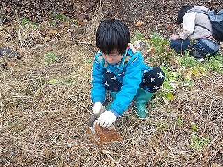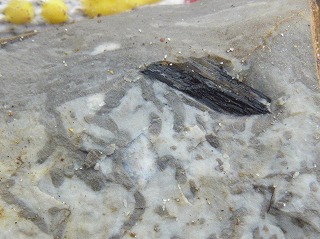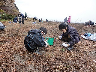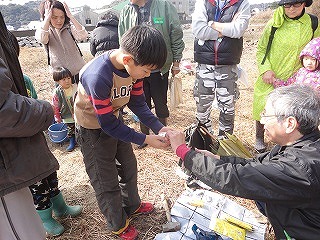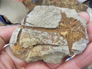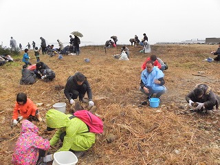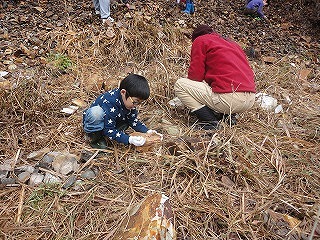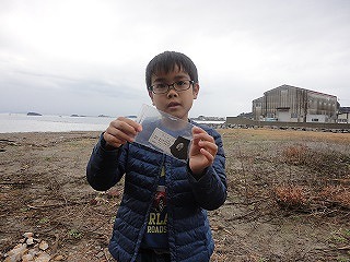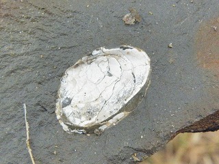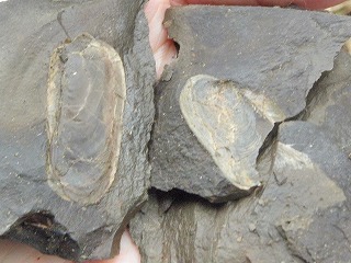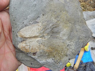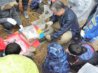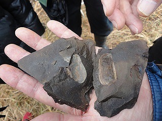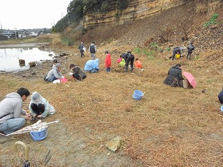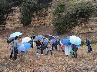 前日から強く降り続いた雨も開催時間には少し治まり、小雨のぱらつく中15家族、44名の参加者に集まっていただきました。観察会当日は、「関東と東海、北陸、それに中国地方で春一番が吹いた。」と気象庁が発表。しかし会場周辺は風も静まり暖かな一日となりました。採集地の崖の前で、この地域の地層の成立ちや化石の出やすい石の説明、落石の危険性の説明ののち思い思いの場所で化石探しをおこないました。この辺の地層からは深海性の生物の化石が採取でき、シロウリガイや葉っぱの化石を見つけた参加者も見られました。参加者は割った石の中から化石を見つけると、講師の先生方に何の化石なのかを熱心に聞いていました。化石採取の後には、講師の計らいにより日本の鉱石がもらえるくじ引きがあり、参加者全員が楽しみました。(記:田中達)