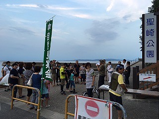 観察会当日は、昼間のうだるような暑さとは打って変わって海風が涼しく感じられ、観察会にはちょうどよい気温となりました。今回の観察会には19家族50名の方々にご参加いただきました。聖崎公園駐車場での受付ののち、会場となる弘法大師像が見える長谷崎まで歩いて移動しました。ウミホタル捕獲のため、まだ明るいうちに、豚のレバー、鮭の切り身や薄皮を剥いだチクワなどを入れたガラス瓶の罠を、海底が砂地の海中に沈め30分ほど待ちます。ウミホタル捕獲までの間、三河湾内の対岸4ヶ所で開催されていた花火大会も見ることができた。子どもたちは指導員が捕獲したアカテガニに実際に触れて、雄雌の見分け方などを観察しました。
