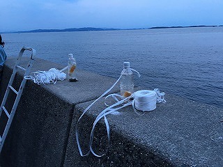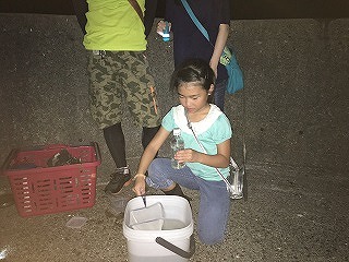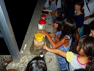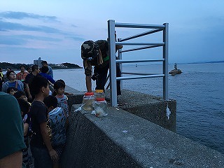 ガラス瓶を海中に入れ約30分経過した頃、ウミホタル捕獲のための罠を引き上げると、仕掛けたエサによってウミホタルの入っている数が違うのがよくわかりました。今回の仕掛けたエサの中では、紀文のチクワにウミホタルが良く入っていました。ウミホタルの発光を見るためには刺激が必要なため、ウミホタルの入ったバケツの水をコンクリートに流して刺激を与えるとウミホタルは青白く光り、参加者からは歓声が上がりました。