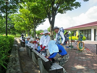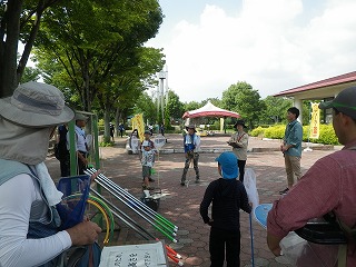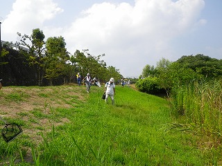 【左】木陰で待機 【中】主催者挨拶 【右】ヤブカラシ