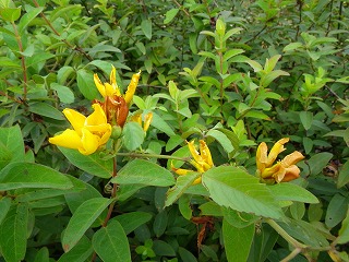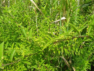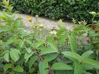 【左】ジガバチの仲間 (吸蜜中) 【中】開花期を過ぎたビヨウヤナギ 【右】湿地のトクサ群落