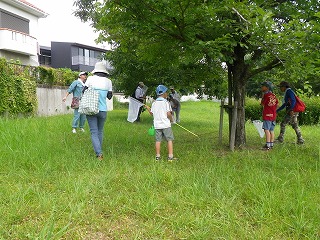【左】湿地、草地の生きものさがし 【中】ショウリョウバッタ捕まえた 【右】