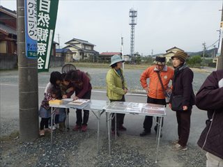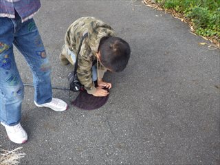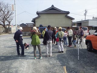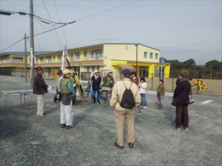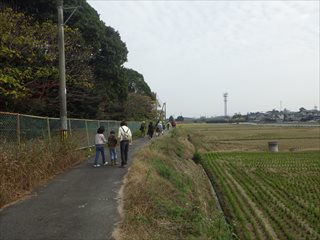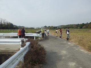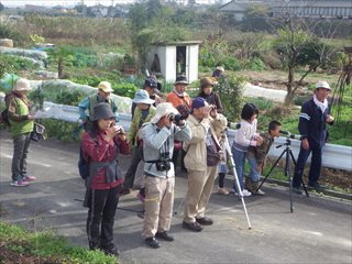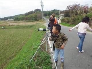 田んぼと畑が広がった中の道を水路に沿って西へ。セキレイ三種がお目見え。上空で2〜3羽のカラスが鳥を追い回している。すかさず古川先生が「ハイタカだ」と叫び、みな一斉にその様子を追う。電線にツグミが、田んぼの中にケリが、池の上の木にアオサギが、こちらはじっとしているので子どもたちもスコープでじっくり観察できた。また鳥の写真を用意し、現れた都度その写真を見せた。「こんなに多くの鳥がいるなんて初めて知った」と感激の弁。