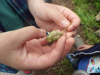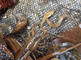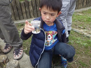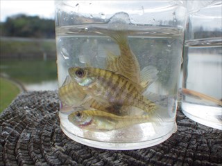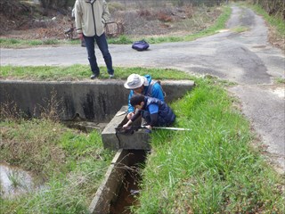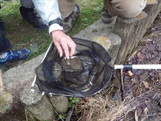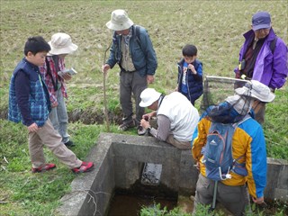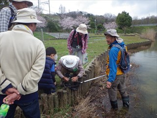 ニホンアカガエル(オタマジャクシ)、アカメダカ、ヨシノボリ?、シュレーゲルアオガエル、アマガエル、カワニナ、シジミ、タニシ、ブルーギル(外来)、アメリカザリガニ(外来)