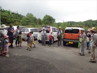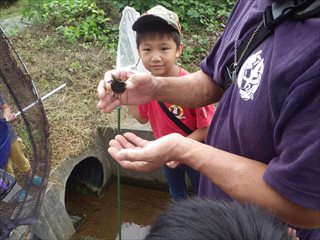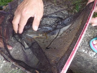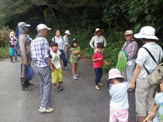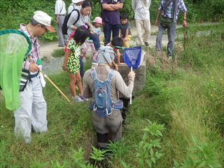 曇りで太陽はないが蒸し暑い日。元気な子たちが集まった。「蜂とヘビに注意」と促し出発。クズが甘いにおいを発し、ウスバキトンボが群飛。水路まで来たところ魚影が。すぐさまタモを入れる。メダカとドジョウが入る。子どものカメも。