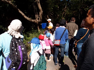 今日は子どもたちが多く集まってくれた。「蜂とヘビに注意」するよう促し、自然観察と工作の材料を集めるため自然公園の中へ。
