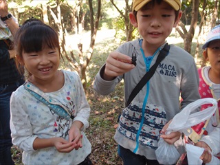 【左】公園内で材料探し…木の実や枝など    【右】材料にはならないがクワガタ。嬉しい