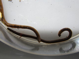 【左】コウガイビル   【中】キマワリ(幼虫)   【右】カミキリムシ(幼虫)