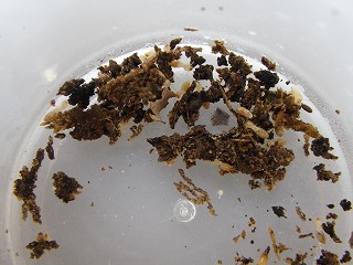 公園の雑木林には伐採・剪定された樹木や落ち葉が沢山積まれていましたが、朽木状態に至っているものは僅かでした。それて゜も腐った樹皮や落ち葉をめくると次々に期待した虫たちを採集・観察する事ができました。90分程の間に採集された生きものは全部で二十余種になりました。中でもカメムシの仲間が多種観察できました。集めた生きものを観察容器に移し替え、脚(足)の本数別に分類して観察してもらいました。最後に生態系における朽木の生きものの役割について補足解説して閉会しました。