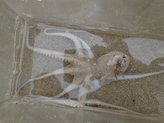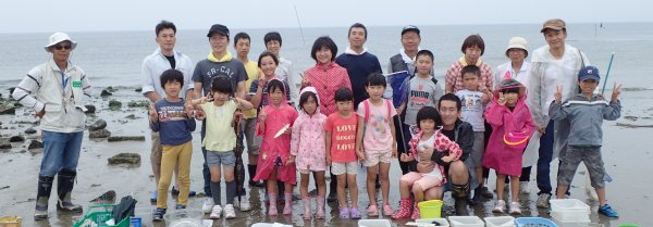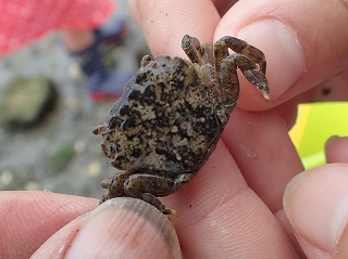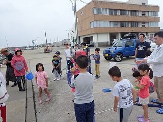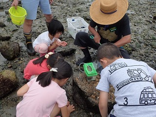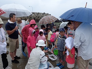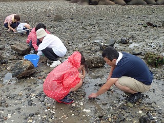それぞれ家族ごとに活動しました。タモを使って魚をねらう者、石を反転し石の下に隠れている生き物を探す者、捨て石やテトラポットに付着している生き物を見る者、それぞれ楽しそうに海辺の生き物に触れていました。